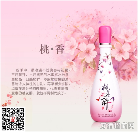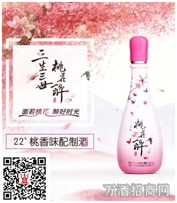桃花醉酒顾名思义就是于桃花相关的酒,古人尝尝以桃花喻人,以桃花意情,可以说桃花本身就是具有深层含义的东西。桃花可观赏,桃汁可调酒。将三月花开,六月成熟的水蜜桃取汁倒入酒坛,用上等白酒精心调制,便得了这芳香四溢的桃花酒。由于目标人群是女性为主要消费人群,所以桃花醉的口感甜美、柔和,适合女性在任何场合饮用。