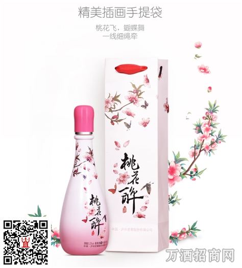 据泸州老窖电子商务股份有限公司创新品牌负责人介绍,桃花醉的品牌标识拓取自唐伯虎《桃花庵歌》真迹,再近演化为符合当代审美的视觉印记,而外包装上的女性图片是由百鸟朝凤插画师的原创团队创作。粉红的桃花醉盛入优美弧线的瓶身,一切都跟美有关,让人忍不住想要品尝,就像桃花醉的广告语:面若桃花,醉好时光。