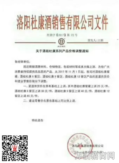 因近期酿酒原材料、仓储物流、包装材料等成本大幅上涨,为给广大消费者持续提供高品质的产品。从2017年11月1日起,我司对酒祖杜康窖藏、酒祖杜康6窖区、酒祖杜康9窖区、酒祖杜康12窖区产品的渠道供货价和建议零售价做如下调整:
