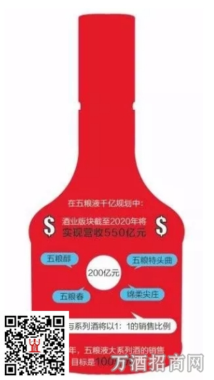 在五粮液千亿规划中,酒业版块截至2020年将实现营收550亿元,其中大系列酒(包括五粮醇、五粮特头曲、五粮春、绵柔尖庄等)要实现销售规模200亿元,五粮液与系列酒将以1:1的销售比例,实现五粮液与系列酒的双品牌驱动。2018年,五粮液大系列酒的销售目标是100亿元。