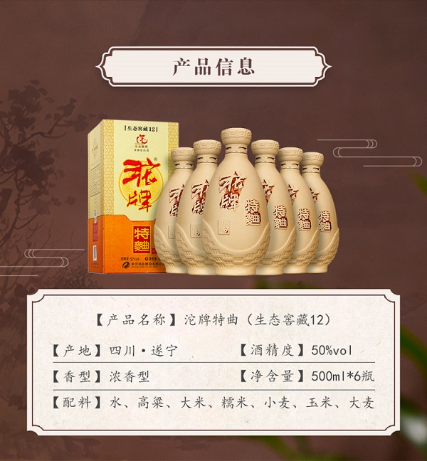 “悠悠岁月酒,滴滴沱牌情”是上世纪90年代出现在中央电视台黄金时间段的广告词,让一个不为人知的白酒品牌,走进公众视野,走入了百姓生活。“沱牌”一个来自四川的知名白酒品牌。沱牌特曲原浆,沱牌大曲,沱牌舍得,在市场反映不错,深得广大消费者的喜爱。50度沱牌特曲生态窖藏12浓香型白酒,是由四川沱牌舍得酒业股份有限公司推出的一款中高端白酒。采用高粱、糯米、大米、玉米、小麦、大麦六粮精酿,特级酒质。