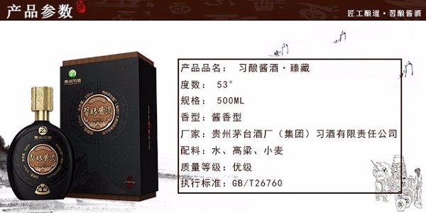 习酿酱酒“臻藏”酒是习酒公司倾力打造的一款酱香型产品。“臻藏”酒是臻系列中的一款超高端产品,黑色礼盒高雅大方,包装箱盒融入了贵州地域特征“铜鼓”文化及酿酒文化,酒瓶由铜鼓演变而成,象征着祥和安泰的鸟图腾点缀于酒瓶之上,昭示着在这片土地上生存繁衍的族民渴望着自由平安吉祥!